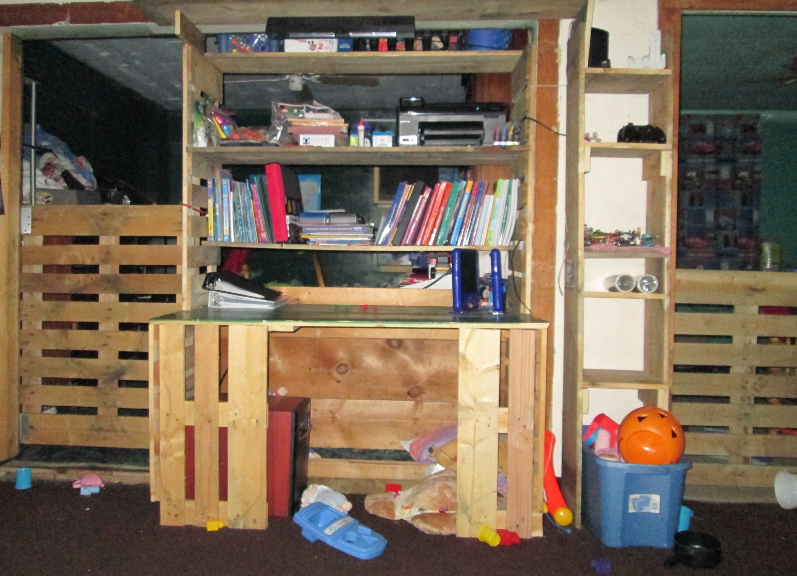 Del took down our Christmas tree and decided to move the TV to another wall in our living room. In the process he decided to make me a desk from pallets so that I have place to work again when those times arrive that I have books/products all over the place. Plus now we have all of our home school supplies in one location instead of all over the house.