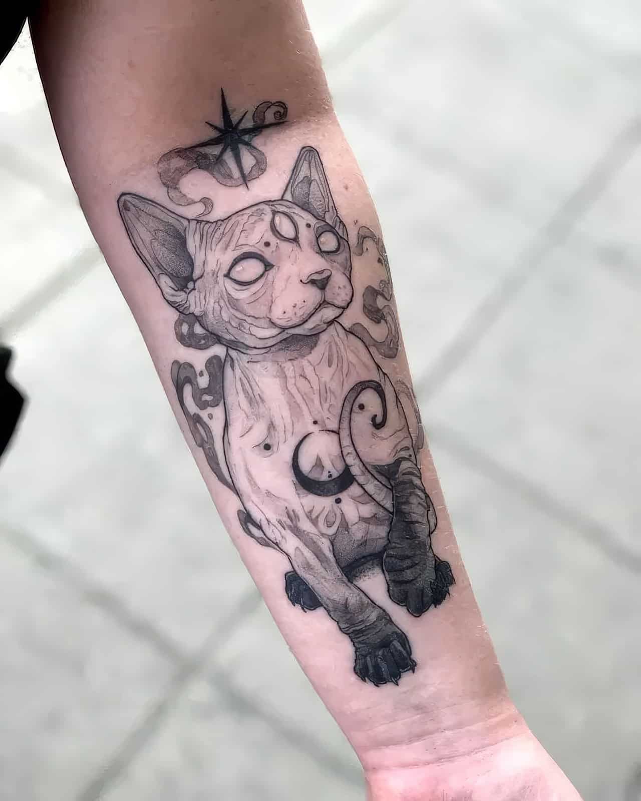 This tattoo is not just any cat; it’s got an edge. It could have a royal collar studded with gems or be wrapped in ornate designs that remind you of old tales and magic. Choose this if you want something that speaks to both your love for cats and your fascination with the mystical side of things.