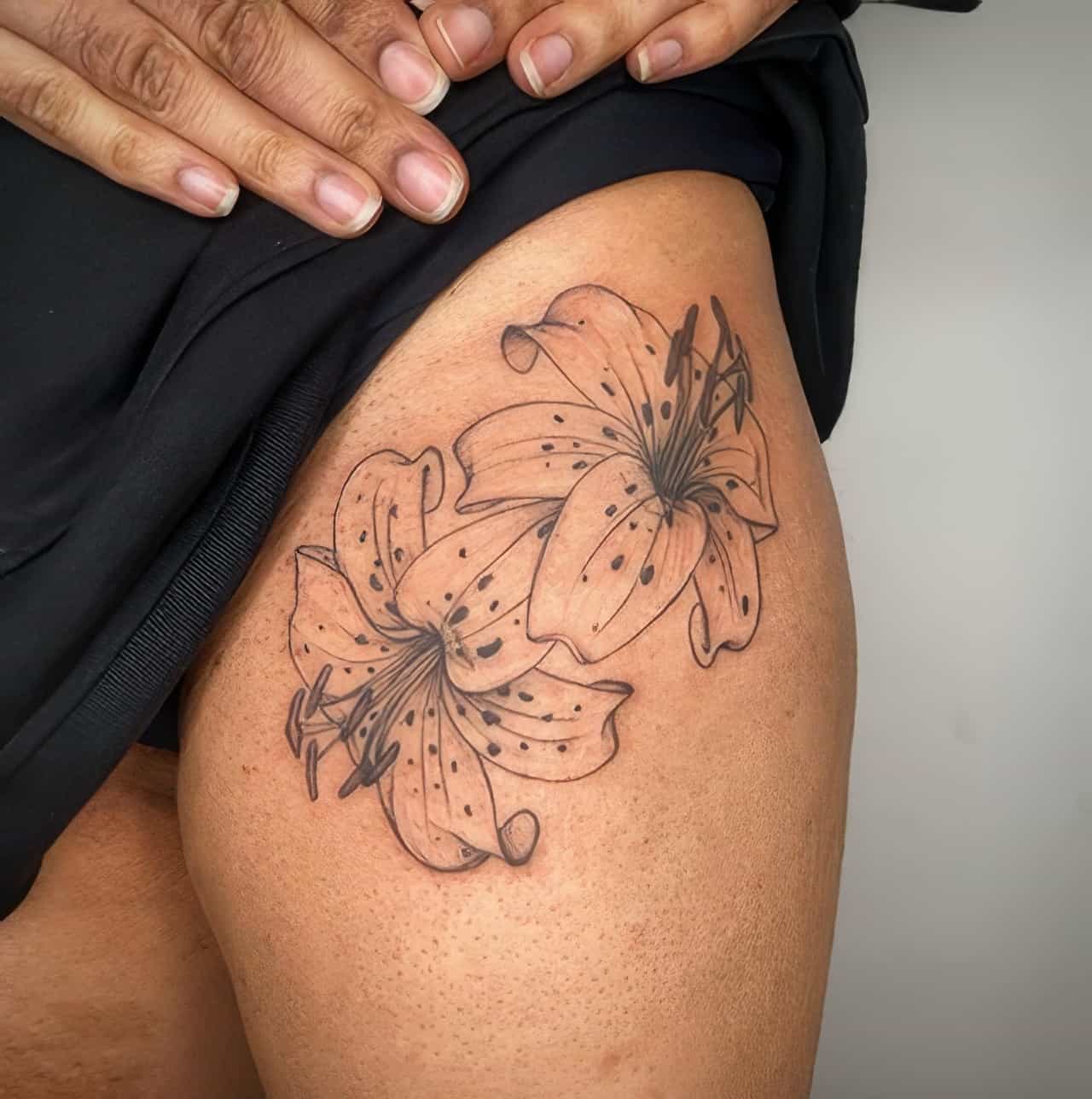 Watercolor lilies burst with vibrant hues, each petal delicately painted – an artistic floral tattoo that whispers tales of nature’s splendor. Curious? Keep reading to unravel more captivating designs!