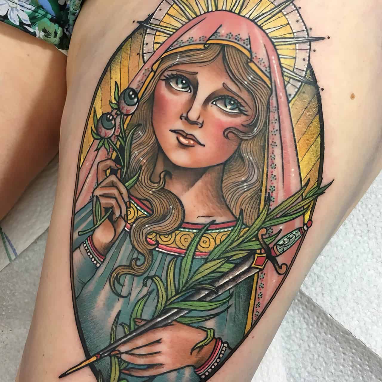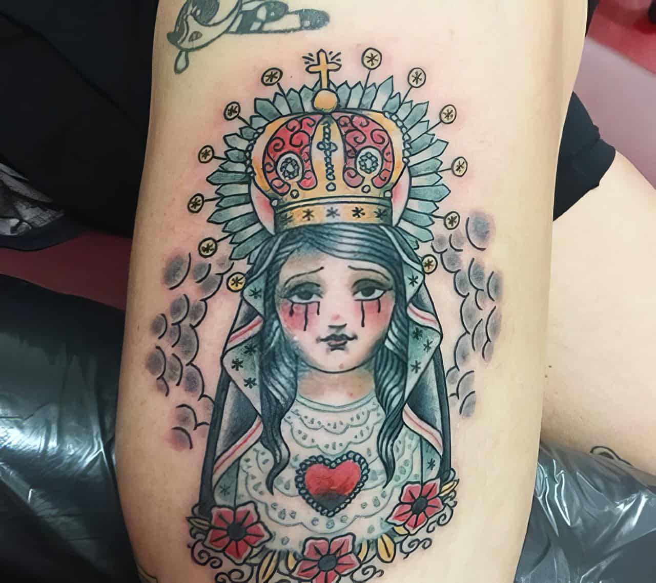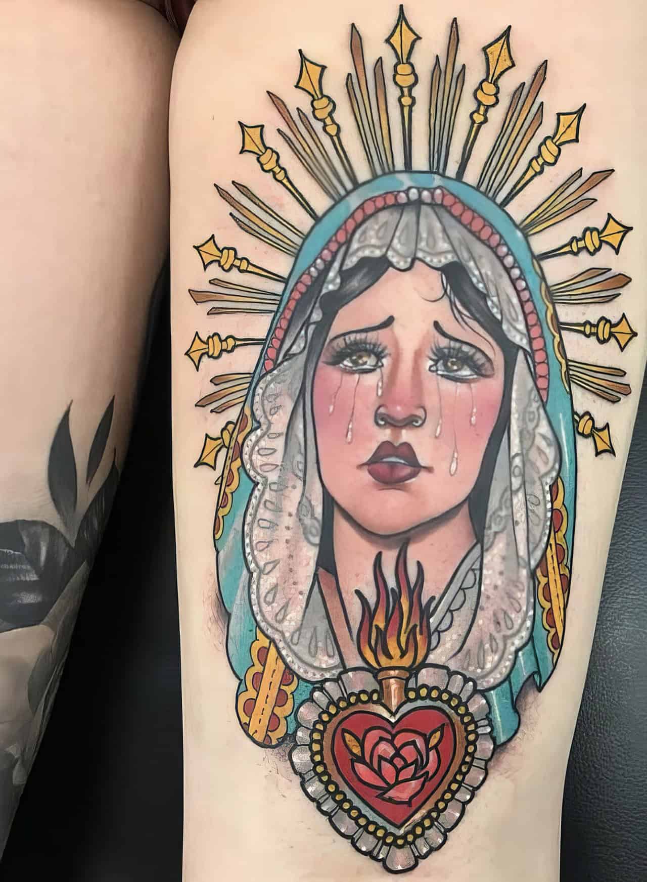 Some folks go for a simple outline, while others opt for detailed, colorful designs. Popular spots for Mary ink? The back, arms, and even over the heart.